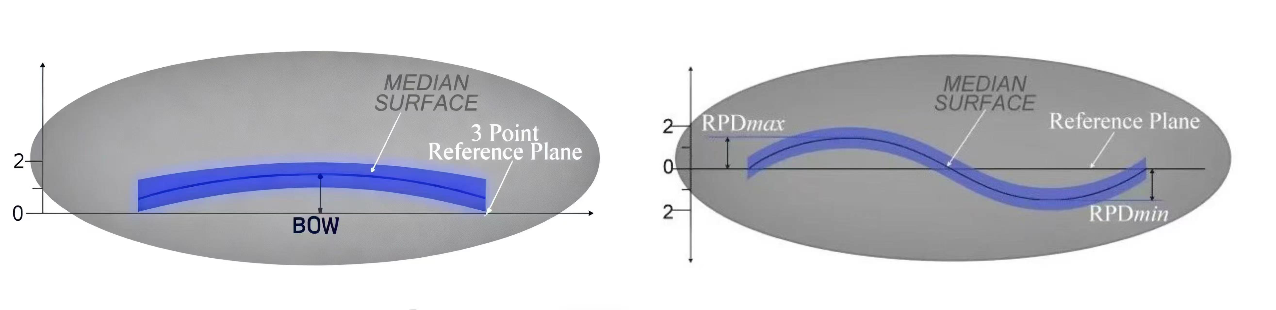 धनुष संकेतक वेफर केंद्र क्षेत्र के ऊर्ध्वाधर ऑफसेट पर ध्यान केंद्रित करता है, जो केवल स्थानीय झुकने की स्थिति को दर्शाता है। यह उन परिदृश्यों के मूल्यांकन के लिए उपयुक्त है जो स्थानीय समतलता के प्रति संवेदनशील हैं। वार्प संकेतक समग्र समतलता और विकृति का आकलन करने के लिए उपयोगी है क्योंकि यह संपूर्ण वेफर सतह के विचलन पर विचार करता है और संपूर्ण वेफर के लिए समग्र समतलता पर जानकारी प्रदान करता है।