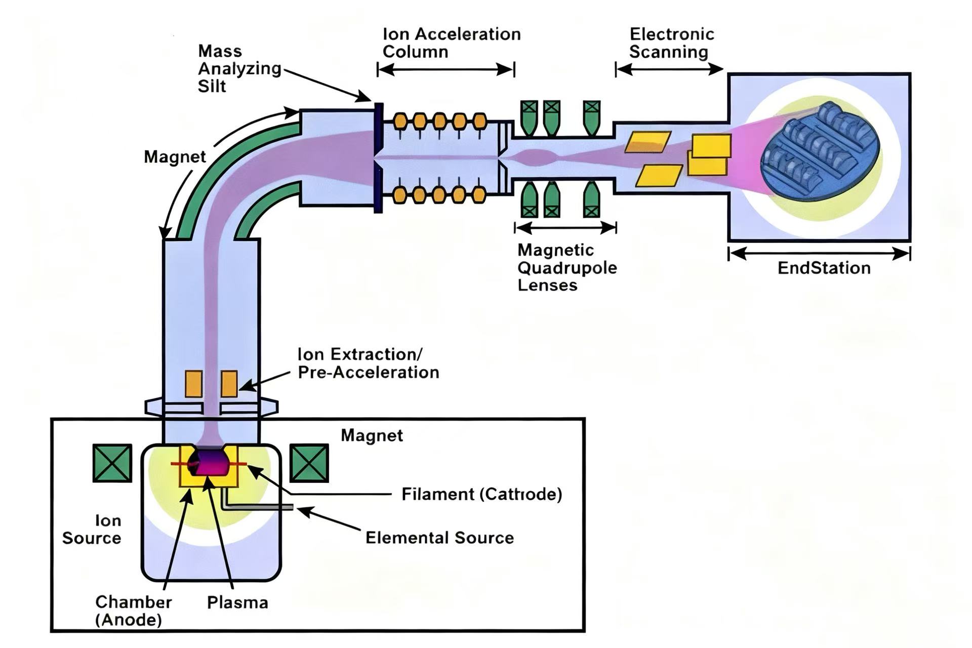 2.आयन इम्प्लांटेशन सेमीकंडक्टर निर्माण में प्राथमिक डोपिंग तकनीक है, जिसके कई फायदे हैं, जैसे उच्च डोपिंग सटीकता, कम प्रक्रिया तापमान और सब्सट्रेट सामग्री को कम नुकसान। विशेष रूप से, आयन आरोपण प्रक्रिया में आवेशित आयन बनाने के लिए अशुद्धता परमाणुओं को आयनित करना शामिल होता है, फिर इन आयनों को एक उच्च-तीव्रता वाले विद्युत क्षेत्र के माध्यम से तेज करके एक उच्च-ऊर्जा आयन किरण बनाई जाती है। फिर सेमीकंडक्टर सतह पर इन तेजी से बढ़ने वाले आयनों द्वारा प्रहार किया जाता है, जिससे समायोज्य डोपिंग गहराई के साथ सटीक आरोपण की अनुमति मिलती है। यह तकनीक विशेष रूप से MOSFETs के स्रोत और नाली क्षेत्रों जैसे उथले जंक्शन संरचनाओं को बनाने के लिए उपयोगी है, और अशुद्धियों के वितरण और एकाग्रता पर उच्च-सटीक नियंत्रण की अनुमति देती है।