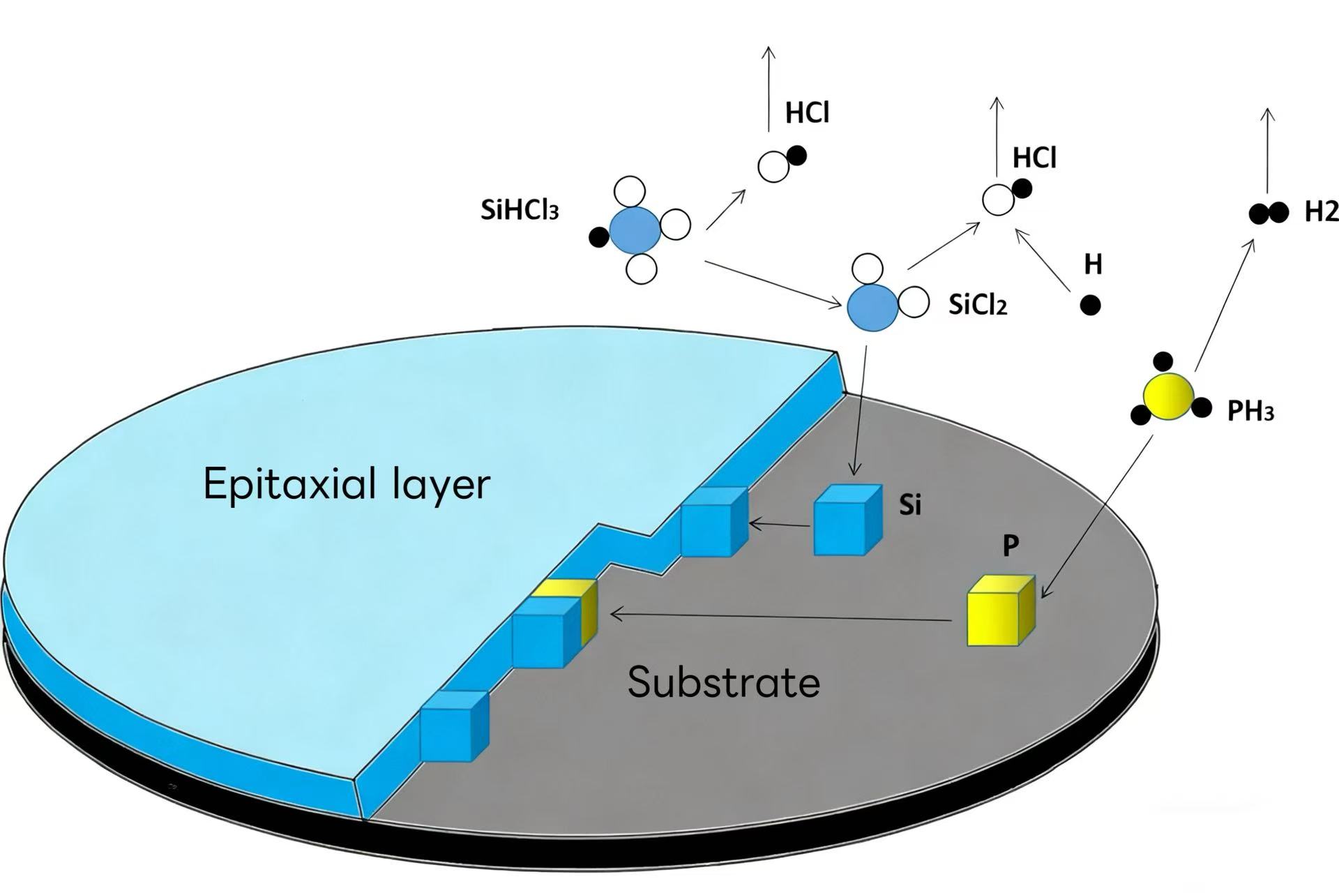 सिलिकॉन एपिटैक्सी आमतौर पर वाष्प चरण एपिटैक्सी भट्ठी का उपयोग करता है। इसका सिद्धांत यह है कि सिलिकॉन स्रोत (जैसे सिलेन, डाइक्लोरोसिलेन, ट्राइक्लोरोसिलेन, और सिलिकॉन टेट्राक्लोराइड) का अपघटन सिलिकॉन उत्पन्न करने के लिए हाइड्रोजन के साथ प्रतिक्रिया करता है। विकास के दौरान, PH₃ और B₂H₆ जैसी डोपिंग गैसों को एक साथ पेश किया जा सकता है। डोपिंग एकाग्रता को एक विशिष्ट प्रतिरोधकता के साथ एक एपिटैक्सियल परत बनाने के लिए गैस के आंशिक दबाव द्वारा सटीक रूप से नियंत्रित किया जाता है।