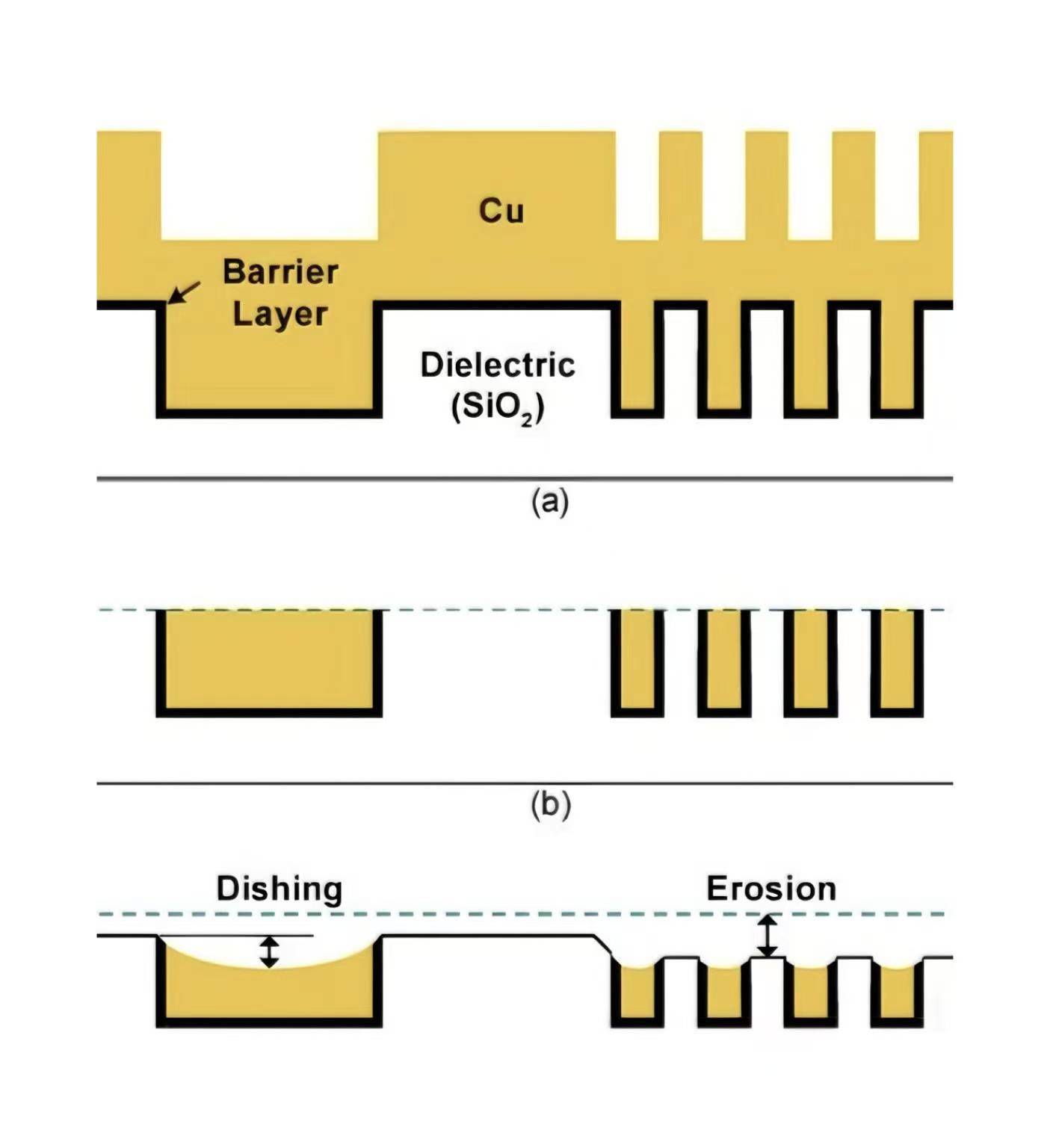 दोनों दोषों के कारण सेमीकंडक्टर उपकरणों का प्रदर्शन कई तरह से नकारात्मक रूप से प्रभावित होता है। इनसे इंटरकनेक्शन प्रतिरोध में वृद्धि हो सकती है, जिसके परिणामस्वरूप सिग्नल में देरी हो सकती है और सर्किट प्रदर्शन में गिरावट आ सकती है। इसके अलावा, डिशिंग और कटाव भी असमान इंटरलेयर ढांकता हुआ मोटाई का कारण बन सकते हैं, डिवाइस के विद्युत प्रदर्शन की स्थिरता को बाधित कर सकते हैं और इंटरमेटेलिक ढांकता हुआ परत की टूटने की विशेषताओं को बदल सकते हैं। बाद की प्रक्रियाओं में, वे लिथोग्राफी संरेखण चुनौतियों, खराब पतली-फिल्म कवरेज और यहां तक कि धातु के अवशेषों का भी कारण बन सकते हैं, जिससे उपज पर और असर पड़ सकता है।