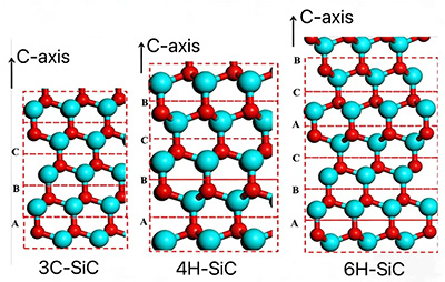 बेशक, SiC सामग्री एक Si परमाणु और एक C परमाणु के एकल टेट्राहेड्रोन से नहीं बनी है, बल्कि अनगिनत Si और C परमाणुओं से बनी है। बड़ी संख्या में Si और C परमाणु लहरदार दोहरी परमाणु परतें (C परमाणुओं की एक परत और Si परमाणुओं की एक परत) बनाते हैं, और कई दोहरी परमाणु परतें SiC क्रिस्टल बनाने के लिए ढेर हो जाती हैं। Si-C डबल परमाणु परतों की स्टैकिंग प्रक्रिया के दौरान होने वाले आवधिक परिवर्तनों के कारण, वर्तमान में विशिष्ट व्यवस्था के साथ 200 से अधिक विभिन्न क्रिस्टल संरचनाएं हैं। वर्तमान में, व्यावहारिक अनुप्रयोगों में सबसे आम क्रिस्टल रूप 3C-SiC, 4H-SiC और 6H-SiC हैं।