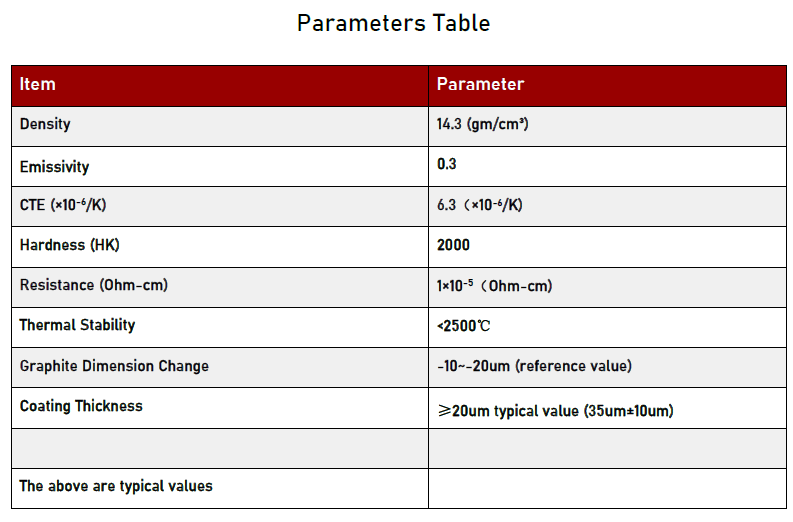 टैंटलम कार्बाइड अत्यधिक उच्च गलनांक (लगभग 3880℃), उत्कृष्ट तापीय चालकता, बेहतर रासायनिक स्थिरता और उत्कृष्ट यांत्रिक शक्ति के साथ उच्च प्रदर्शन करने वाली सामग्री है। विशिष्ट प्रदर्शन पैरामीटर इस प्रकार हैं: